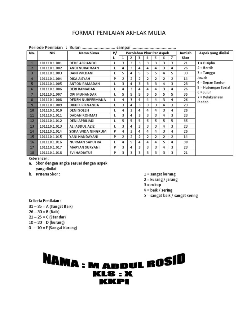 Format nilai akhlak, format nilai kepribadian smkdeskripsi lengkap .